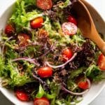 - Assemble the Salad: Place the mixed leafy greens, halved cherry tomatoes, and finely sliced red onion in a large bowl. Drizzle the prepared dressing over the salad ingredients and toss gently to ensure everything is evenly coated.