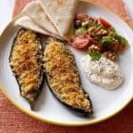 - Top Aubergine with Hummus and Crumbs: Spread a couple of teaspoons of houmous on each aubergine slice. Pour the breadcrumb mixture onto a large plate and press the houmous-coated side of each aubergine slice into the crumbs so they adhere evenly.