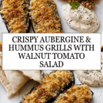 A delicious and healthy recipe featuring grilled aubergine slices topped with creamy hummus and crunchy breadcrumbs, paired with a fresh walnut, parsley, and cherry tomato salad. Perfect as a light meal or appetizer that combines smoky, creamy, and tangy flavors.