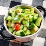 A refreshing and healthy Avocado Cucumber Salad combining crisp cucumbers, creamy avocados, juicy roma tomatoes, and fresh spring onions, all tossed in zesty Italian dressing and freshly cracked black pepper for flavor.