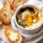 Keywords: baked eggs, shirred eggs, mushrooms, breakfast recipe, brunch, creamy eggs, spinach, parmesan