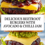 These delicious beetroot burgers are a hearty, vegetarian-friendly option packed with mushrooms, tofu, black beans, and pecans, offering a vibrant color and satisfying texture. Perfect for grilling or pan-frying, they are topped with optional vegan cheese, fresh avocado lime mash, and a tangy tomato chili jam for an exciting flavor combination.