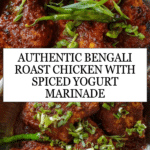 Bengali roast chicken is a flavorful dish featuring bone-in chicken thighs or drumsticks marinated in aromatic spices and yogurt, then pan-fried and simmered in a rich, spiced masala sauce made with ghee, whole spices, and caramelized onions. The result is tender, juicy chicken infused with traditional Bengali flavors, garnished with fresh green chillies and coriander.