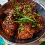 Bengali roast chicken is a flavorful dish featuring bone-in chicken thighs or drumsticks marinated in aromatic spices and yogurt, then pan-fried and simmered in a rich, spiced masala sauce made with ghee, whole spices, and caramelized onions. The result is tender, juicy chicken infused with traditional Bengali flavors, garnished with fresh green chillies and coriander.