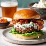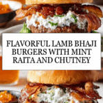 A flavorful fusion Bhaji Burger featuring spiced lamb mince patties combined with crispy onion bhajis, fresh cucumber mint raita, and vibrant toppings served on toasted brioche buns. This recipe brings together Indian spices and classic burger elements for a unique and delicious meal.