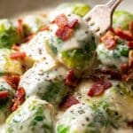 A delicious and comforting dish of Brussels sprouts cooked in a rich, creamy carbonara-style sauce with crispy bacon, parmesan, and mozzarella cheese. Perfect as a hearty side or a standalone vegetarian-friendly meal when omitting bacon.