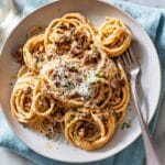 This hearty Bucatini with mushrooms and sausage recipe combines tender bucatini pasta with a rich, creamy mushroom sauce infused with sausage and white wine. The earthy flavors come from rehydrated porcini mushrooms simmered with garlic, chili flakes, and a splash of cream, finished off with fresh parsley and grated parmesan for the perfect comforting Italian meal.