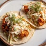 - Assemble and Serve: Remove the tacos from the pan and place them on a serving plate. Top each taco generously with the prepared ranch slaw. Optionally, drizzle extra ranch dressing or buffalo sauce on top. Serve immediately while warm for best flavor and texture.
