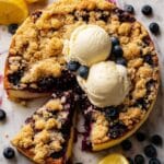 This Bursting Blueberry Crumb Cake is a delightful combination of a lemon vanilla cake base topped with fresh blueberries coated in lemon juice and sugar, all crowned with a buttery, crumbly streusel. Perfectly moist and bursting with fresh blueberry flavor, this cake is great served warm with vanilla ice cream or enjoyed at room temperature.