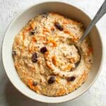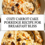 A comforting and nutritious carrot cake-inspired porridge featuring grated carrots, cinnamon, nutmeg, and raisins cooked with creamy oats, offering a deliciously warm and wholesome breakfast option.