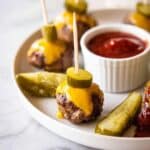 These Cheeseburger Party Meatballs are a delicious and easy appetizer perfect for any gathering. Made with seasoned ground beef, they are pan-fried until golden brown and topped with melted processed cheese and tangy baby gherkins for a fun cheeseburger twist. Serve them with ketchup for dipping and watch them disappear quickly!