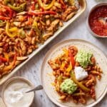 - Serve and enjoy: Remove everything from the oven and transfer the fajita mixture to the center of the table. Serve with warm tortillas, lime wedges, and sides of soured cream, salsa, and guacamole for guests to assemble their own fajitas as they like.