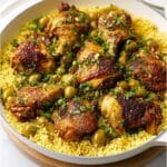 Keywords: chicken thighs, couscous, one-pot meal, Moroccan spices, turmeric, garam masala, olives, lemon, easy dinner