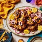 - Step 8: Transfer the chicken to a serving dish, scatter with red onion rings, and serve with lemon wedges on the side.