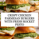 These Chicken Parmesan Burgers with Rocket Pesto combine crispy breadcrumb-coated chicken breasts topped with melted mozzarella, nestled in toasted buns with a vibrant, zesty rocket pesto. The pesto made of fresh rocket, pine nuts, garlic, Parmesan, and lemon adds a fresh, flavorful twist, making this a delicious and satisfying gourmet burger perfect for a comforting meal.