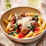 This hearty Chicken Sausage Pasta is a flavorful and comforting dish featuring tender chicken sausage, roasted red peppers, and spinach in a tomato-based sauce, served over perfectly cooked penne or rigatoni pasta. A quick and easy meal that’s perfect for weeknight dinners.