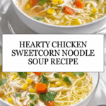 A comforting and wholesome Chicken, Sweetcorn & Noodle Soup featuring tender chicken, fresh vegetables, and vermicelli noodles simmered in a flavorful homemade chicken stock, perfect for warming up any day.