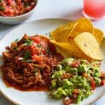 - Serve: Serve the chicken tinga topped with the fresh tomato salsa, accompanied by tortilla chips, guacamole, and extra coriander leaves for garnish.