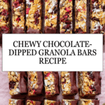 These chocolate-dipped chewy granola bars combine the nutty crunch of seeds and rolled oats with the sweetness of honey and dried cranberries. Topped with rich dark chocolate, they make a perfect homemade snack that’s both satisfying and delicious.
