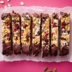 These chocolate-dipped chewy granola bars combine the nutty crunch of seeds and rolled oats with the sweetness of honey and dried cranberries. Topped with rich dark chocolate, they make a perfect homemade snack that’s both satisfying and delicious.