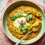 - Serve: Spoon the curry into bowls, topping with extra coconut yogurt if desired, and garnish with freshly picked coriander leaves and extra ginger slices for added freshness and flavor.