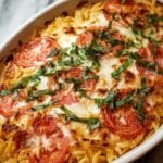 This Creamy Tomato Basil Orzo Bake is a comforting and flavorful one-pot meal featuring tender orzo pasta cooked in a savory tomato and cream sauce, enriched with melted mozzarella and Parmesan cheeses and fresh basil. Perfect for a cozy dinner, this dish combines creamy textures with fresh herbaceous notes for an inviting Mediterranean-inspired bake.