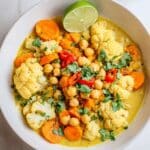 Keywords: curried cauliflower stew, chickpea curry, coconut curry stew, vegetarian stew, healthy curry recipe, easy one-pot meal