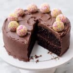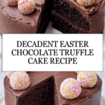 A rich and decadent Easter chocolate truffle cake featuring moist cocoa sponge layers sandwiched with fruity jam, topped with a smooth chocolate ganache icing, and decorated with homemade chocolate truffles coated in colorful sprinkles. Perfect for festive celebrations and chocolate lovers.