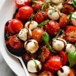 This fresh and vibrant Caprese Salad features halved bocconcini mozzarella, juicy cherry tomatoes, and aromatic basil, all tossed in a zesty homemade dressing and finished with a delicious balsamic glaze. Perfect as a light appetizer or side dish, this Italian classic is quick to prepare and bursting with fresh flavors.