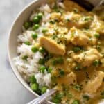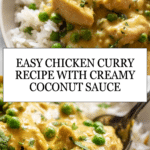 This easy chicken curry recipe is a flavorful and comforting dish made with tender chicken thighs simmered in a rich coconut milk and curry powder sauce. Perfect for a quick weeknight meal, it combines aromatic spices with creamy coconut milk and a touch of sweetness from peas, garnished with fresh cilantro for a vibrant finish.