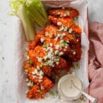 - Serve: Top with blue cheese crumbles, serve with blue cheese or ranch dressing, celery pieces, and sprinkle with chopped green onions.