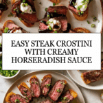 Easy Steak Crostini with Horseradish Sauce is a delicious appetizer perfect for parties or a casual snack. Tender ribeye slices atop toasted baguette make every bite irresistible, especially with the creamy, tangy horseradish cheese sauce.