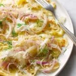 - Plate the salad: Spread the dressed fennel and onion mixture flat on a serving plate in a “carpaccio” style, which means thin and evenly spread out over the plate.
