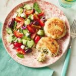 Keywords: feta cakes, Greek salad, vegetarian, baked potato cakes, Mediterranean recipe, healthy meal, wholemeal flour