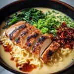 Fiery Chicken Ramen is a bold and spicy noodle soup featuring tender marinated chicken breasts, a rich and flavorful gochujang-infused broth, fresh ramen noodles, and an array of vibrant toppings including soft-boiled eggs, corn, bamboo shoots, and seaweed. This Korean-inspired dish balances heat with umami and is perfect for warming up on chilly days or whenever you’re craving a satisfying, homemade spicy ramen experience.