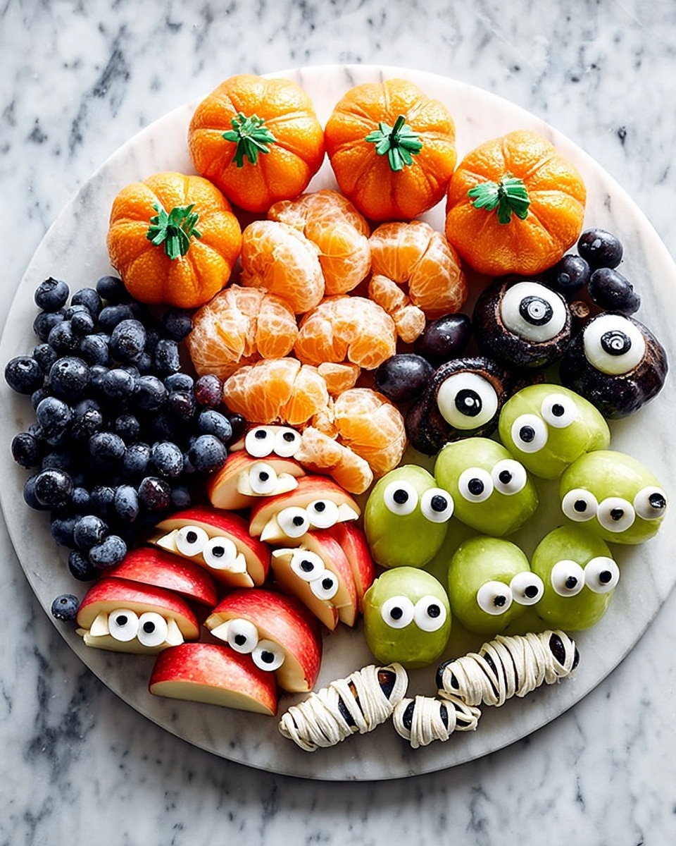 Keywords: Halloween fruit platter, mummy bananas, spooky fruit, healthy Halloween snack, decorated fruit, kids party food, vegan friendly fruit platter