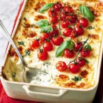 - Assemble the Lasagne – Final Layer: Finish with the last third of the lasagne sheets. Spoon over the remaining béchamel sauce and pesto, then spread the remaining cheeses and all remaining cherry tomatoes, including the whole tomatoes still on the vine, over the top.