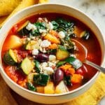 A hearty, versatile fridge-raid soup packed with vegetables, beans, and tender potatoes simmered to perfection in a rich tomato and stock base, topped with fresh parsley and optional feta and olives for an extra burst of flavor. Perfect for using up leftover seasonal greens and pantry staples to create a comforting, nourishing meal.