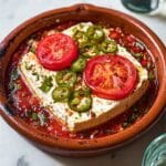 Greek Bouyiourdi is a warm, flavorful baked feta dish combined with ripe tomatoes, garlic, mild green chili, oregano, and olive oil. This traditional Greek appetizer is perfect for serving with warm pita bread for dipping, offering a comforting and aromatic Mediterranean treat.