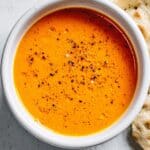 A vibrant and flavorful hot and spicy roasted red pepper and tomato soup, blending smoky roasted red peppers and fresh cherry tomatoes with warming paprika and a subtle nutty texture from ground almonds. This soup is quick to prepare and perfect for a cozy meal.