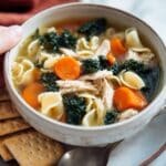 Store leftover soup in an airtight container in the refrigerator for up to 4 days. Reheat gently on the stove or in the microwave until warmed through. Note that noodles may absorb broth over time, so you might want to add a splash of chicken stock or water when reheating.