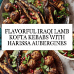 These Iraqi lamb kofta kebabs are a flavorful Middle Eastern dish featuring spiced lamb meatballs grilled to perfection and served on a bed of roasted cumin-scented aubergines drizzled with harissa butter. The kebabs are garnished with fresh herbs and pomegranate seeds and pair wonderfully with traditional sides like hummus, fattoush salad, flatbreads, and tzatziki, making for a vibrant, aromatic, and satisfying meal.