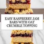 Delicious homemade Jam Bars featuring a buttery oat crust layered with sweet and tangy raspberry preserves. These bars combine a tender base with a crumbly topping, perfect as a snack or dessert for any occasion.