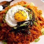 - Serve with Garnishes: Plate the kimchi fried rice and top with a sunny-side up fried egg with a runny yolk. Garnish with black sesame seeds, finely sliced green onions, and crispy seaweed strips for added texture and flavor.