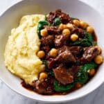 A hearty and flavorful lamb curry slow-simmered with chickpeas and spinach, paired perfectly with a creamy masala-infused mashed potato side. This comforting dish combines tender stewed lamb with aromatic spices and a touch of yogurt for richness, ideal for a satisfying meal.