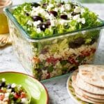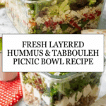 Keywords: layered hummus picnic bowl, tabbouleh salad, feta cheese salad, Mediterranean picnic recipe, easy layered salad, bulghar wheat salad, vegetarian picnic food