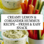 A bright and zesty Lemon & Coriander Hummus combining creamy chickpeas, fresh lemon juice and zest, garlic, tahini, and Greek yogurt, finished with fragrant coriander and a drizzle of extra virgin olive oil. This flavorful dip is perfect as a healthy snack or appetizer.