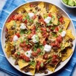 - Finish and Serve: Spoon dollops of half-fat crème fraîche over the nachos, sprinkle with chopped coriander, and serve the guacamole in one or two small dishes on the side for dipping. Serve immediately and enjoy.