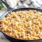 Keywords: mac and cheese, loaded mac and cheese, ground beef recipe, cheesy pasta, comfort food, easy dinner, skillet mac and cheese