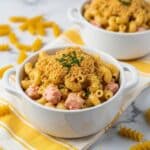 A rich and decadent Lobster Macaroni and Cheese featuring a blend of creamy white cheddar, fontina, and gruyère cheeses with tender lobster folded in, topped with a crunchy, buttery breadcrumb crust and baked to golden perfection.